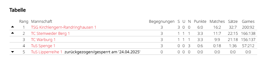 Dirk Vortmeyer, Gerhard Kollweier, Detlef Schirrmacher und Achim Koch vom TC Destel verstärken als Gastspieler in dieser Saison die Mannschaft des TC Stemweder Berg. Nach dem Rückzug der als Favorit gehandelte Mannschaft des TuS Lipperreihe ist die Abstiegsfrage bereits vor dem ersten Ballwechsel geklärt. Nun geht es darum, sich einen der beiden Aufstiegsplätze zu erspielen. Mit einem klaren 6:0 Sieg gegen TuS Spenge, einem 3:3 Unentschieden gegen TC Warburg und einer 2:4 Niederlage gegen Kirchlengern wird tatsächlich der zweite Tabellenplatz erreicht.